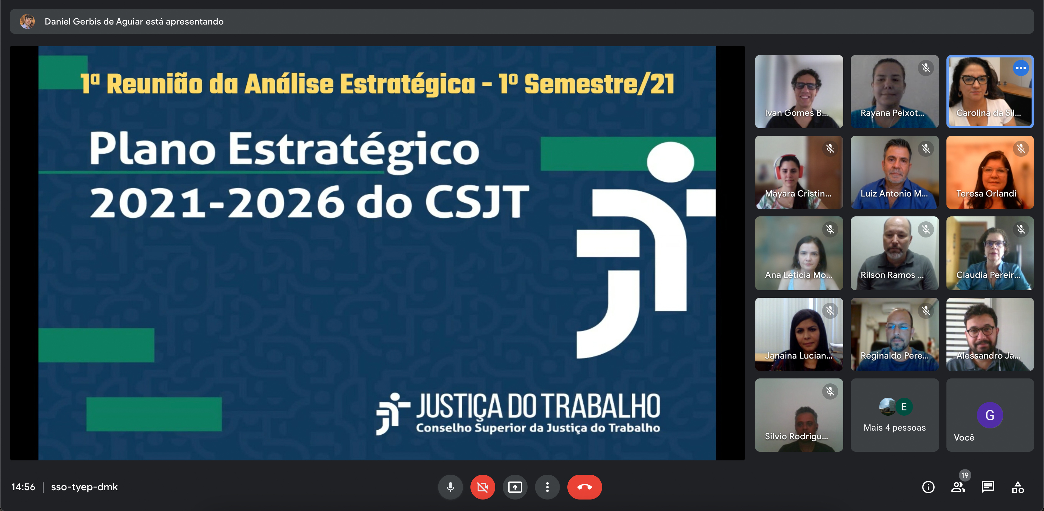 22/9/2021 - O Conselho Superior da Justiça do Trabalho realizou, na última semana, a 1ª Reunião de Análise da Estratégia (RAE) de 2021 do Plano Estratégico do órgão. Coordenado pela secretária-geral e pela Assessoria de Governança e Gestão Estratégica (Aggest) do CSJT, o encontro, realizado por meio telepresencial, contou com a presença de gestores de unidade do órgão, como auditoria, comunicação, gestão de pessoas, orçamento e finanças, ouvidoria e tecnologia da informação, e buscou avaliar os resultados parciais das metas no primeiro semestre de 2021.