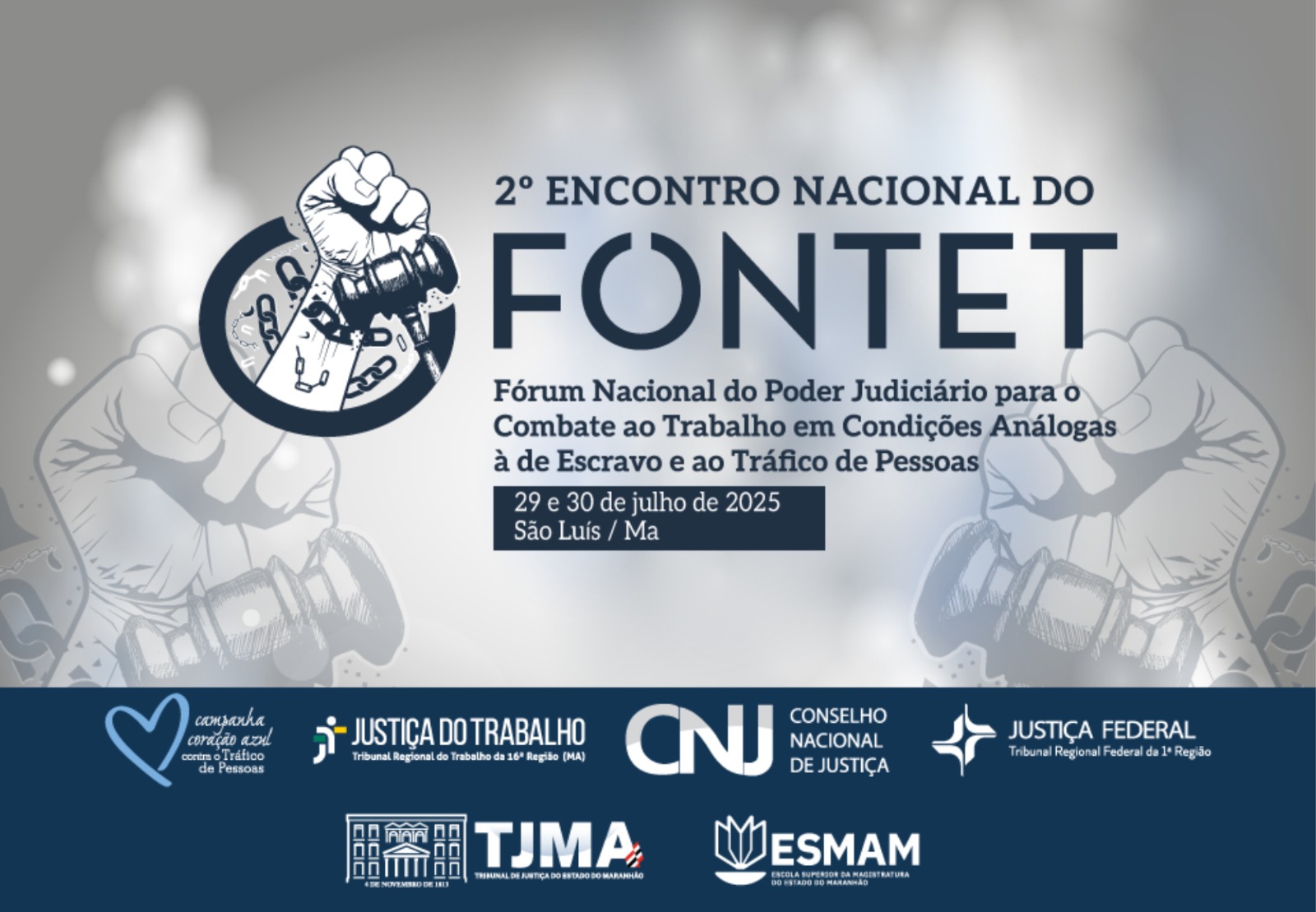 24/7/2025 - Nos dias 29 e 30 deste mês, São Luís vai sediar o 2º Encontro Nacional do Fórum Nacional do Poder Judiciário para Monitoramento e Efetividade das Demandas Relacionadas à Exploração do Trabalho em Condições Análogas à de Escravo e ao Tráfico de Pessoas - FONTET.