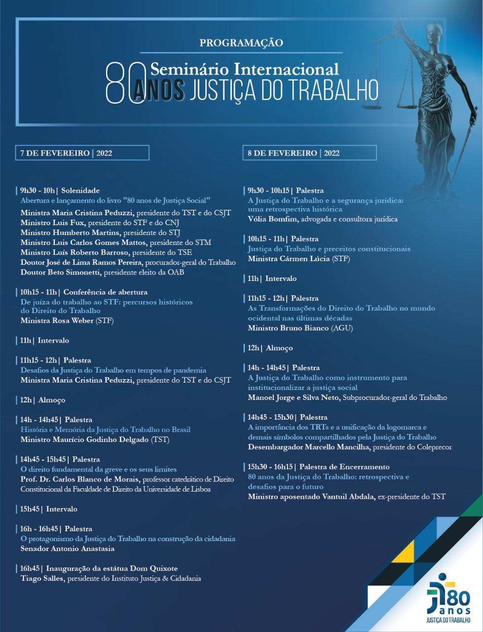 10/01/22 - TST promove Seminário Internacional 80 Anos da Justiça do Trabalho nos dias 7 e 8 de fevereiro