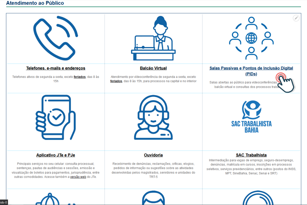 Para utilizar esses serviços, os cidadãos podem acessar a aba Atendimento ao Público (link interno) no portal do TRT-5 e, em seguida, a seção Salas Passivas e Pontos de Inclusão Digital (PIDs) (link interno) para pesquisar pelo nome do município. O link direto para a lista completa, disponibilizada pelo TJ-BA, pode também ser acessado pelo portal do TJ-BA (link externo).