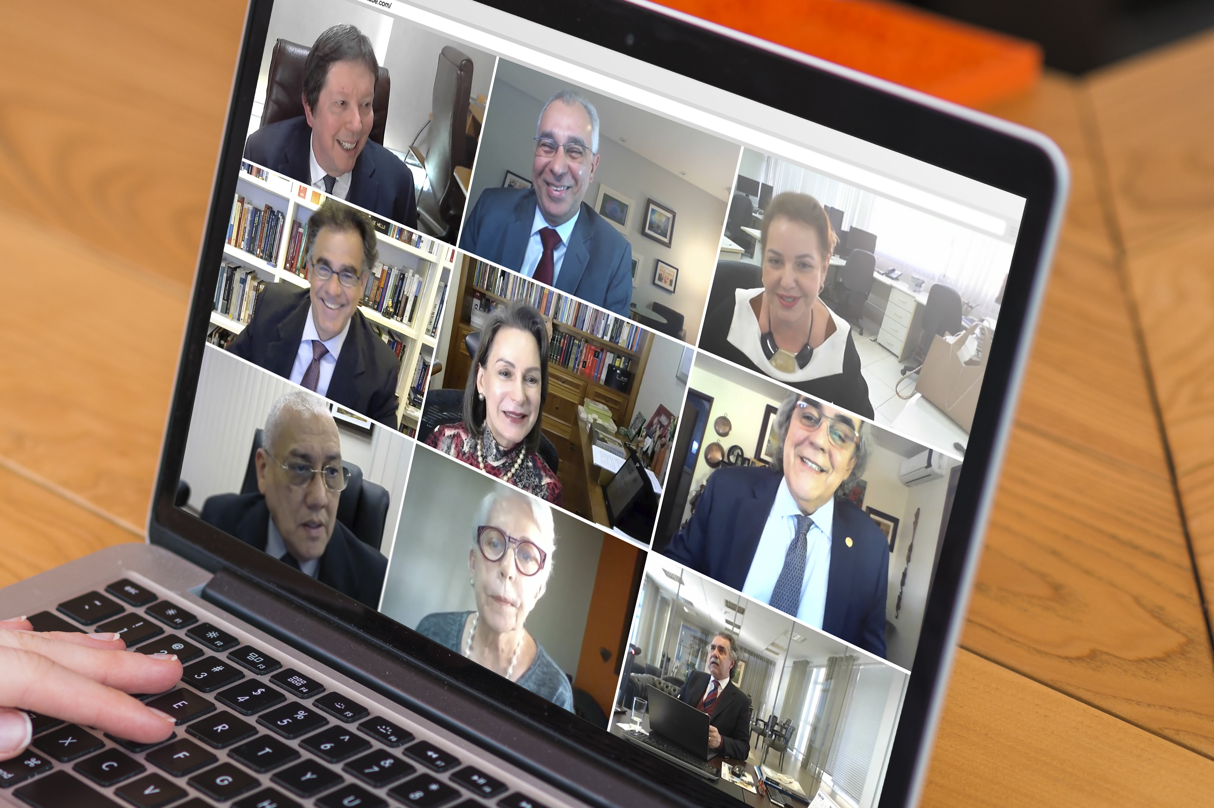 Tela de notebook com print dos conselheiros durante sessão da última sessão telepresencial.