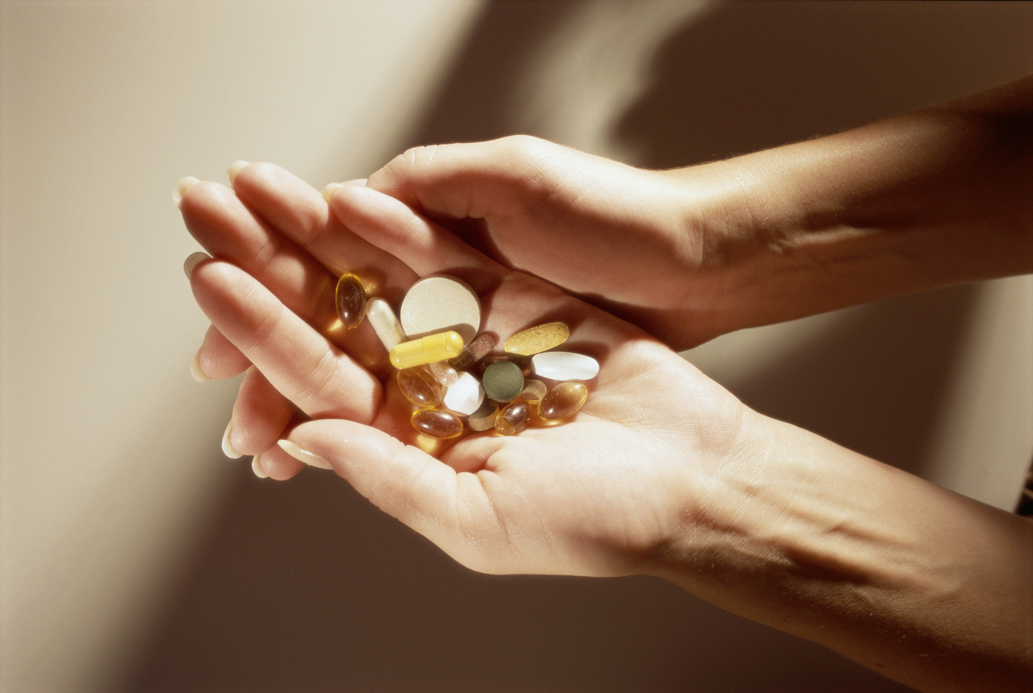 Imagem: pessoa segurando diversos comprimidos nas mãos