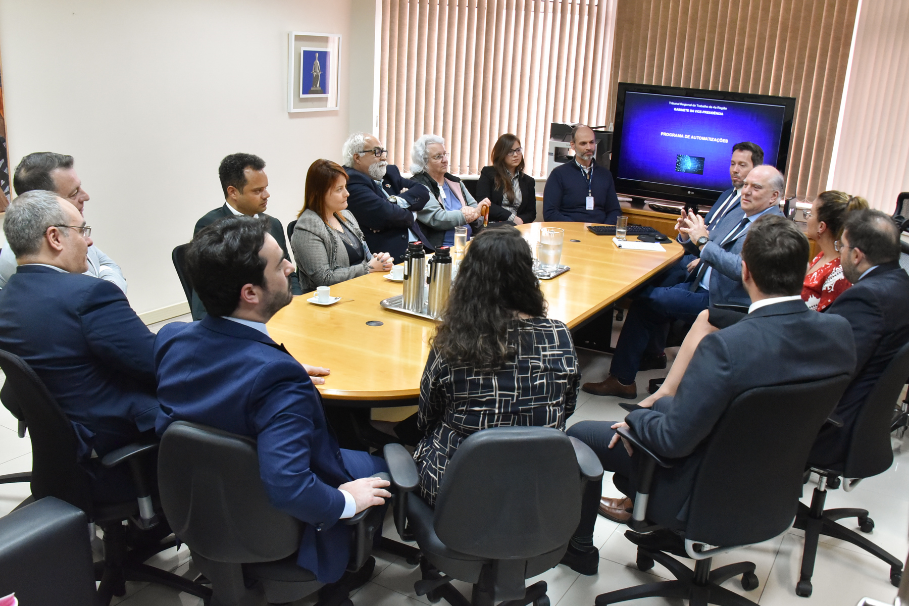 Nessa quinta-feira (6), grupo de advogados visitou o Tribunal Regional do Trabalho da 4ª Região (RS) para conhecer o funcionamento do setor de análise de admissibilidade de recursos de revista. A maioria dos visitantes era formada por representantes da Agetra (Associação Gaúcha dos Advogados Trabalhistas), da Satergs (Associação Gaúcha dos Advogados Trabalhistas de Empresas do RS) e da Abrat (Associação Brasileira dos Advogados Trabalhistas). O grupo foi recebido pelo vice-presidente do Tribunal, desembargador Ricardo Martins Costa.
