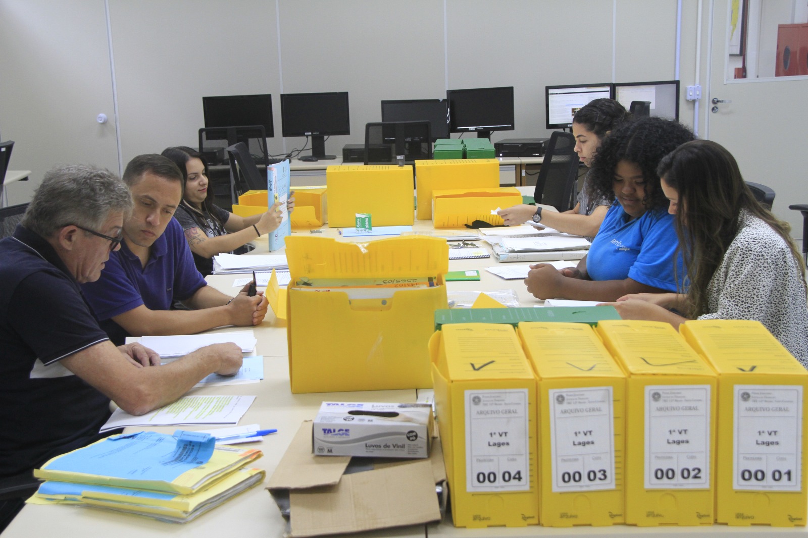 Equipe de Gestão Documental do TRT analisando processos. (Foto: TRT-12)