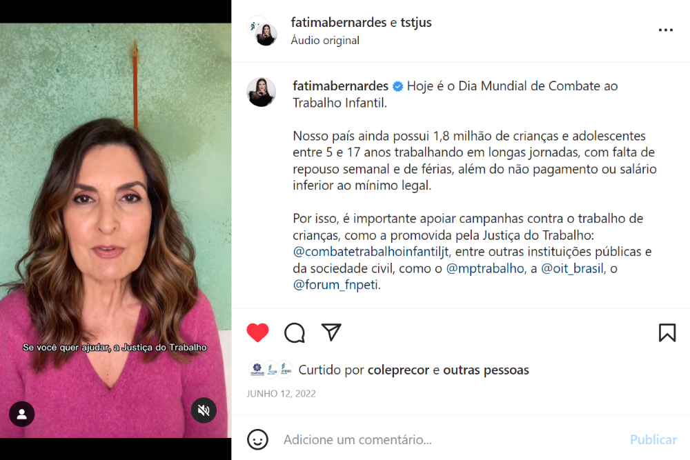 O perfil no Instagram do TST fez um collab (postagem conjunta) com o da apresentadora no dia 12 de junho de 2022. No vídeo, Fátima fala sobre as consequências negativas dessa prática, o compromisso do Brasil de erradicá-la até 2025 e a atuação da Justiça do Trabalho no seu combate. O post atingiu quase dois milhões de pessoas.
