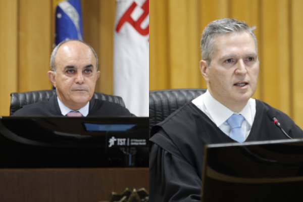 Descrição da imagem destaque: Montagem de duas fotos. Na foto da esquerda, o ministro Cláudio Brandão sentado em sua cadeira na sessão de julgamento. Homem pardo, calvo e de cabelos grisalhos. Na foto da direita, também em sessão de julgamento, está o ministro Douglas Alencar Rodrigues. Homem branco, de cabelos grisalhos.