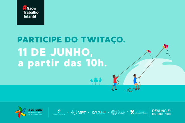 10/5/2021 - O dia 11 de junho será marcado por uma grande ação no Twitter. Em razão do Ano Internacional de Erradicação do Trabalho Infantil, em 2021, instituições públicas e privadas, personalidades, artistas e influenciadores estarão juntos no Twitaço #NãoaoTrabalhoInfantil. A ação, que visa sensibilizar a sociedade sobre o tema, faz parte da campanha “Precisamos agir agora para acabar com o trabalho infantil!”, organizada pela Justiça do Trabalho, pelo Ministério Público do Trabalho (MPT), pelo Fórum Nacional de Prevenção e Erradicação do Trabalho Infantil (FNPETI) e pela Organização Internacional do Trabalho (OIT).