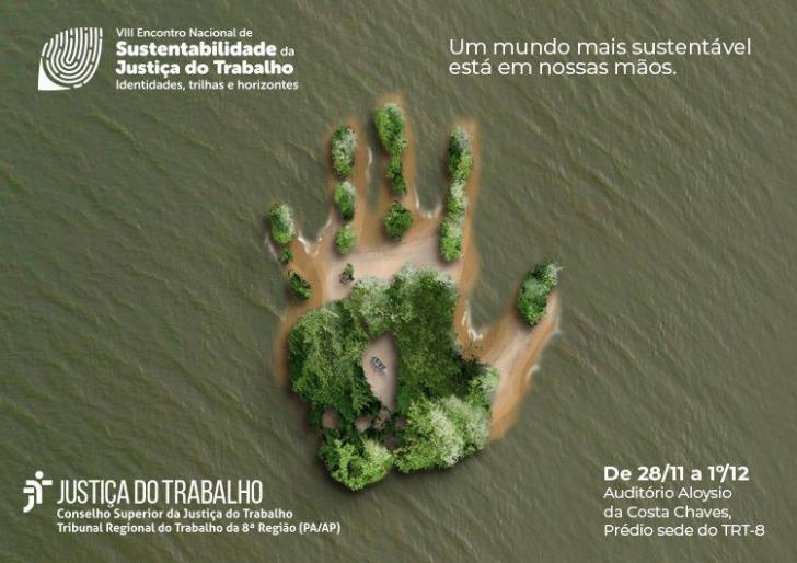 ParaTodosVerem: Arte gráfica mostrando uma ilha em meio à um rio de características amazônicas, as árvores nessa ilha formam um padrão de impressão digital. Na parte superior esquerda, o logo e título do Encontro. Na parte direita a frase: "A sustentabilidade tem a impressão digital de cada um de nós". No canto inferior esquerdo, as informações já ditas no texto. No canto inferior direito, as logos do CSJT e do TRT-8.