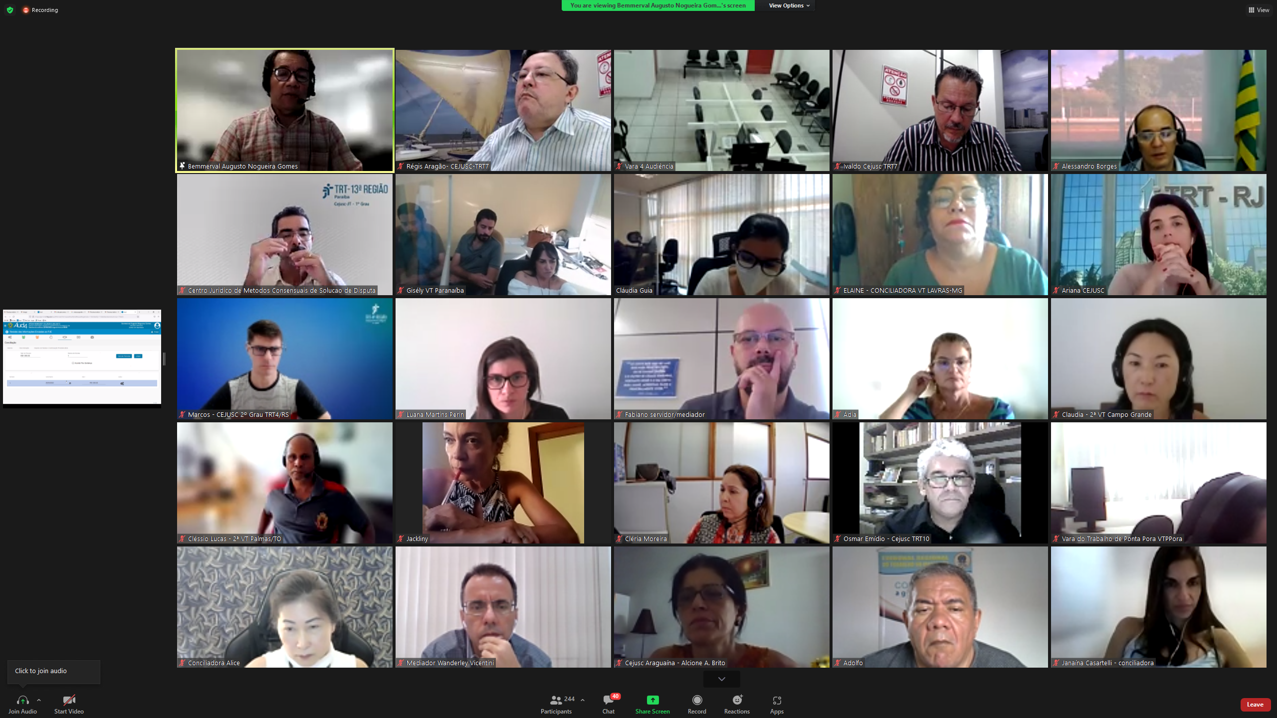 26/4/2022 - A Vice-Presidência do Conselho Superior da Justiça do Trabalho (CSJT) realizou, nesta terça-feira (26), o webinário “Práticas do AUD 4.0 e sistemas integrados para audiências de conciliação". O evento on-line contou com a participação de servidores e servidoras de varas do trabalho e Cejuscs de todo o Brasil. O servidor do TRT da 6ª Região (PE) Bemmerval Augusto Gomes ministrou o conteúdo. Ele atua no Centro Judiciário de Métodos Consensuais de Solução de Disputas de Petrolina (PE).