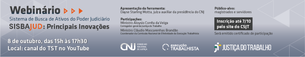 28/09/2020 - A Comissão Nacional de Efetividade da Execução Trabalhista, em parceria com o Conselho Nacional de Justiça, vai promover, no dia 8 de outubro, das 15h às 17h30, o webnário “Sistema de Busca de Ativos do Poder Judiciário – Sisbajud: Principais Inovações”. O evento faz parte das ações preparatórias para a 10ª Semana Nacional da Execução Trabalhista, que está prevista para 30 de novembro a 4 de dezembro.