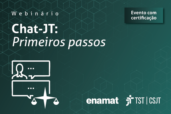 17/2/2025 - Dando continuidade às atividades formativas para o uso da ferramenta de inteligência artificial da Justiça do Trabalho (Chat-JT), o Conselho Superior da Justiça do Trabalho (CSJT), em parceria com o Tribunal Superior do Trabalho e a Escola Nacional de Formação e Aperfeiçoamento de Magistrados do Trabalho (Enamat), vai promover, nos dias 21 e 28 de fevereiro, das 10h às 11h, o “Webinário Chat-JT: Primeiros passos”.