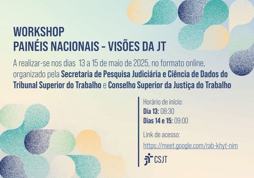 12/5/2025 - A Secretaria de Pesquisa Judiciária e Ciência de Dados do Tribunal Superior do Trabalho (TST) e do Conselho Superior da Justiça do Trabalho (CSJT) promove, de 13 a 15 de maio, o workshop Painéis Nacionais - Visões da Justiça do Trabalho.