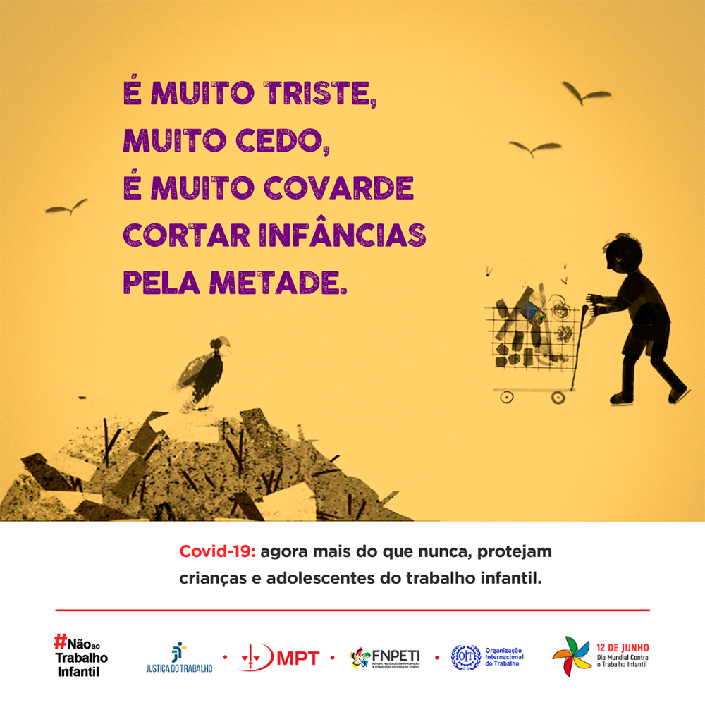 Com o slogan “Covid-19: agora mais do que nunca, protejam crianças e adolescentes do trabalho infantil”, a campanha nacional está alinhada à iniciativa global proposta pela OIT. O objetivo é conscientizar a sociedade e o Estado sobre a necessidade de maior proteção a essa parcela da população, com o aprimoramento de medidas de prevenção e de combate ao trabalho infantil, em especial diante da vulnerabilidade socioeconômica resultante da crise provocada pelo novo coronavírus.