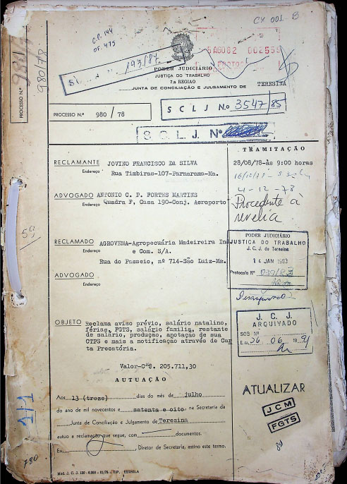 Processo mais antigo. Jovino Francisco da Silva X Agrovema. Reclamante alega que foi demitido sem justa causa e sem receber seus direitos previstos pela CLT. Reclamado foi condenado a pagar Cr$ 189.871,30. |