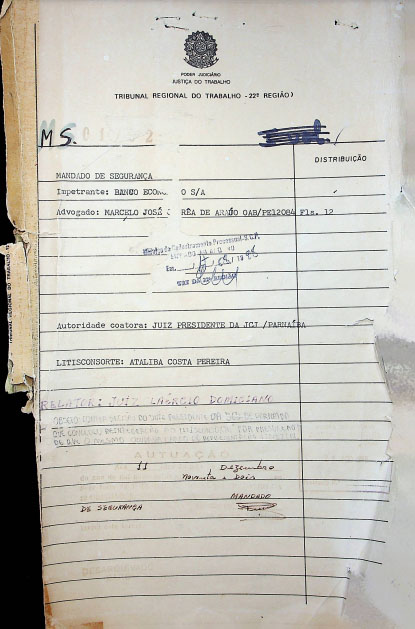 Primeiro julgado do TRT 22. Mandado de Segurança impetrado pelo extinto Banco Econômico S/A contra ação da MM juíza da única Junta de Conciliação e Julgamento de Parnaíba tendo como litisconsorte passivo o Sr. Ataliba Costa Pereira. |
