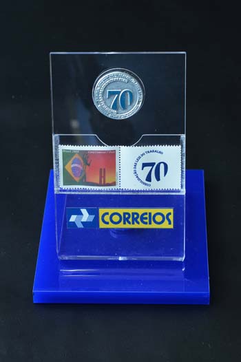 Placa com selo e carimbo comemorativos dos 70 anos da Consolidação das Leis do Trabalho |